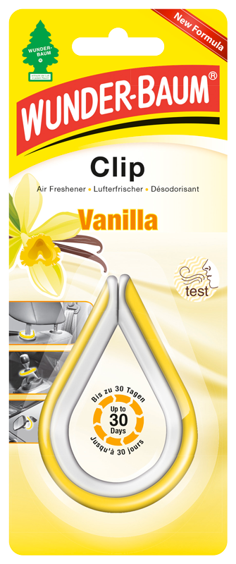 WUNDER-BAUM – Clip vanilka – ks – SK – Vôňa do automobilu v modernom dizajne. Široký rad možností umiestnenia v interiéri vozidla. Príjemná dlhotrvajúca vôňa.